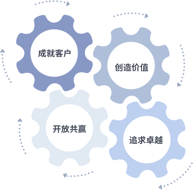 成就客户是一切决策的出发点,,创造价值是衡量所有工作的标准,,,追求卓越是我们做事做人的态度,,开放共赢是我们的格局也是最终的结果。。。。价值观的齿轮环环相扣,,,推动着组织里的每个人不断向前。。